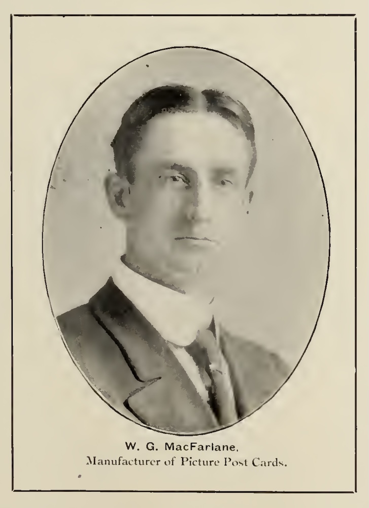 "As an apostle of the picture post card in Canada, Mr. MacFarlane occupies a foremost position. About five years ago, in conjunction with Grip, Limited, Toronto, he started out to publish cards and souvenir books. He assumed all the publishers' risks, Grip, Limited, taking care of the details of manufacture. The business grew rapidly, and in February of this year Mr. MacFarlane took the business over from Grip, Limited, and located in the Westwood Building, at 72 Bay street, these premises offering exceptional advantages for offices, sample andwarerooms.