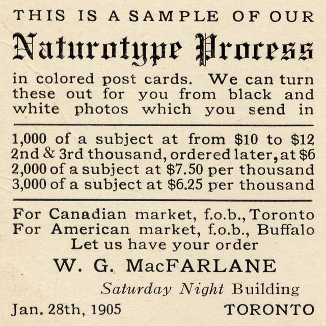 "As an apostle of the picture post card in Canada, Mr. MacFarlane occupies a foremost position. About five years ago, in conjunction with Grip, Limited, Toronto, he started out to publish cards and souvenir books. He assumed all the publishers' risks, Grip, Limited, taking care of the details of manufacture. The business grew rapidly, and in February of this year Mr. MacFarlane took the business over from Grip, Limited, and located in the Westwood Building, at 72 Bay street, these premises offering exceptional advantages for offices, sample andwarerooms.